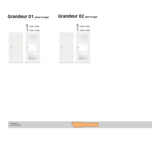 Mit der modernen Innentür Grandeur, bestätigt Herholz seinen Ruf als Trendsetter. Zielgruppe sind trend - aber auch klassisch orientierte, preisbewusste Kunden. Die Oberfläche der erfolgreichen Türenserie überzeugt auch durch ihre brillante Verarbeitung in den Fräsungen und tollen Gebrauchseigenschaften. Gerade in der Ausführung mit dem besonderen Stilmittel „V-Fuge“ zeigt sich exklusives Design auf höchstem Niveau. Das Modell ist in den Ausführung mit oder ohne V-Fuge erhältlich.